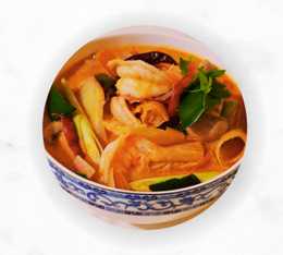 Sopa de langostinos con setas, leche de coco, hoja de lima, galanga, lemongrass, cilantro y pasta de chilli thaï