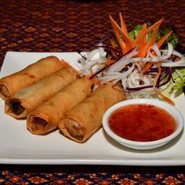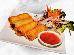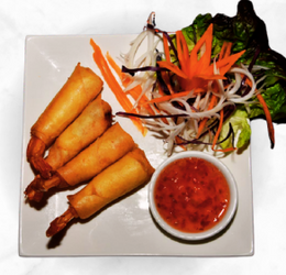 Rollitos de langostinos fritos, pollo picado cilantro y pimienta