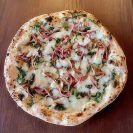 Mozzarella, guanciale, champiñones, crema de trufa, rúcula y aceite de oliva virgen extra