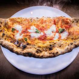 Relleno de ricotta fresca, mozzarella, salame picante. Cubierto con tomate, mozzarella, aceite de oliva virgen extra y albahaca