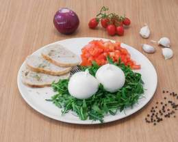 Rúcula, Grana Padano DOP en virutas y rallado, tomate cherry y crema de vinagre balsámico negro