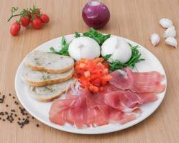 Relleno de ricotta fresca, mozzarella, jamón cocido. Cubierto con tomate, mozzarella, aceite de oliva virgen extra y albahaca