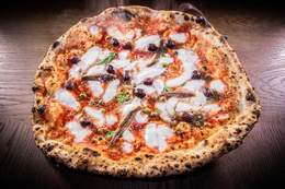 Tomate, mozzarella, salame picante, jamón cocido, champiñones, olivas negras y aceite de oliva virgen extra
