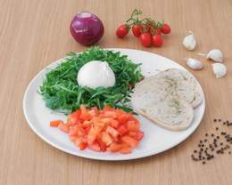 Tomate, mozzarella, olivas negras, champiñones, tomate cherry, cebolla roja, aceite de oliva virgen extra y albahaca