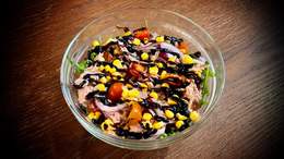 Rúcula, atún, tomate cherry, maíz, cebolla roja y crema de vinagre balsámico