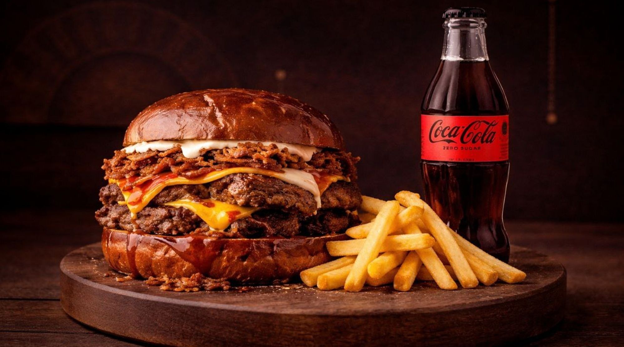 Булочка-Бріош, дві котлети з яловичини та дві скибки чедру, мариновані огірки, хрустка кранч цибуля, угорський бекон политий джемом з бекону та крафтовий соус айолі з пармезаном