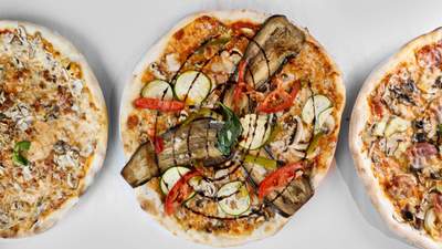 Tomate, mozzarella, champiñones, alcachofas, queso de cabra, pimientos asados en casa y reducción de vodka