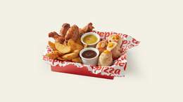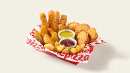 Un combo de nuestros entrantes clásicos: delicias de pollo, bombas de mozzarella y patatas gajo. Incluye 2 salsas de 30g para mojar.