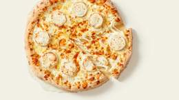 Masa con sémola malteada, salsa carbonara, mezcla de queso mozzarella, queso trufado y queso provolone, champiñones, mayonesa trufada y flores secas.