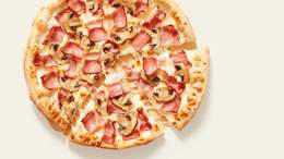 Masa fresca, doble de Bacon, champiñón, salsa carbonara, fundido para pizza y extra de Queso fundido.
