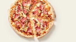Masa fresca, bacon, champiñón, pollo, fundido para pizza, mezcla de salsa barbacoa y carbonara y extra de fundido para pizza.