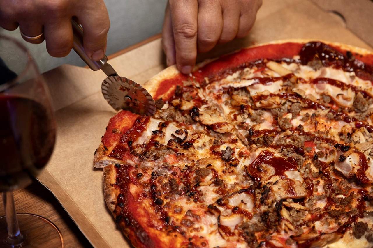 Masa madre de 28-30cm al estilo americano, Tomate, Mozzarella, Pollo, Beicon, Setas y Cebolla crujiente. (Fermentación de la masa +24h)