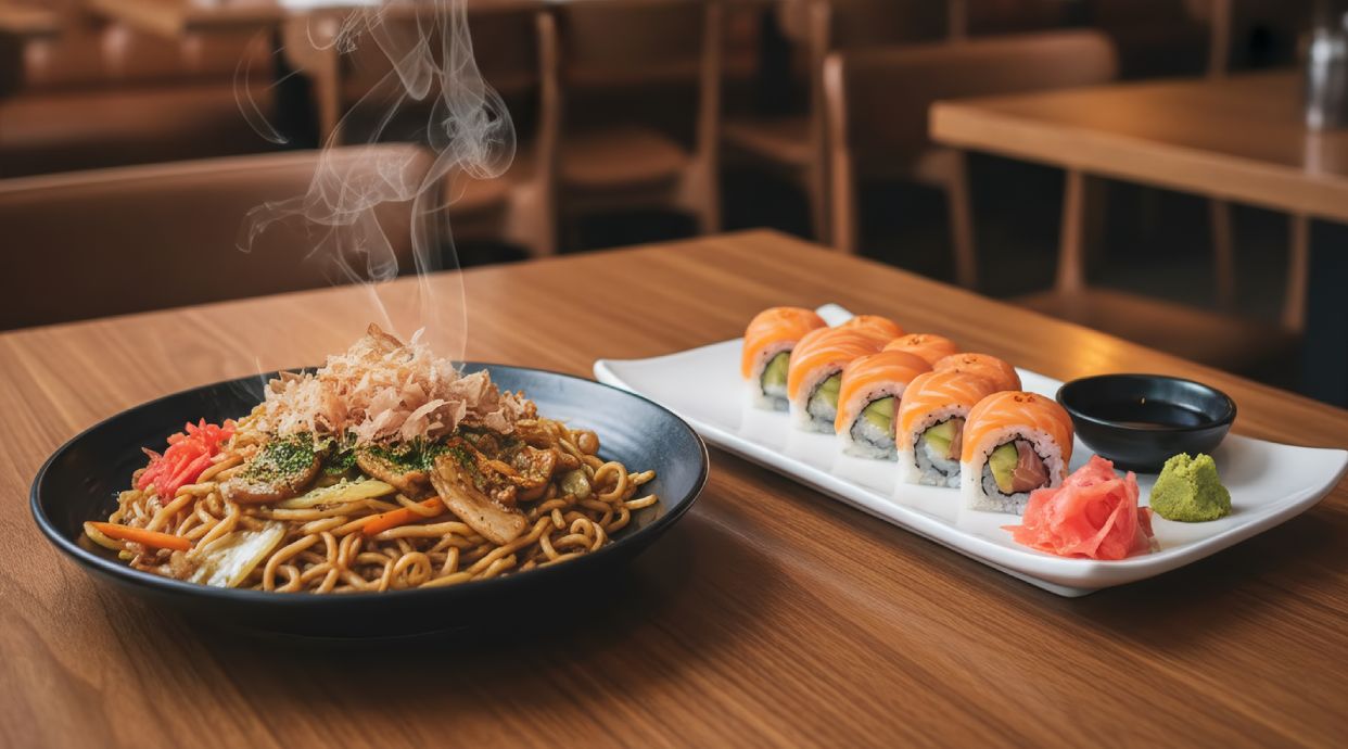 Con arroz, alga nori, sésamo, aguacate, salmón, con salsa flameada, teriyaki y almendra.