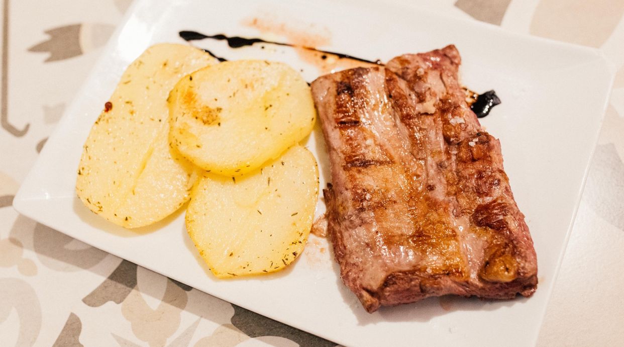 Carne de lagarto ibérico a la parrilla (200 g.) con batata y pimientos caramelizados