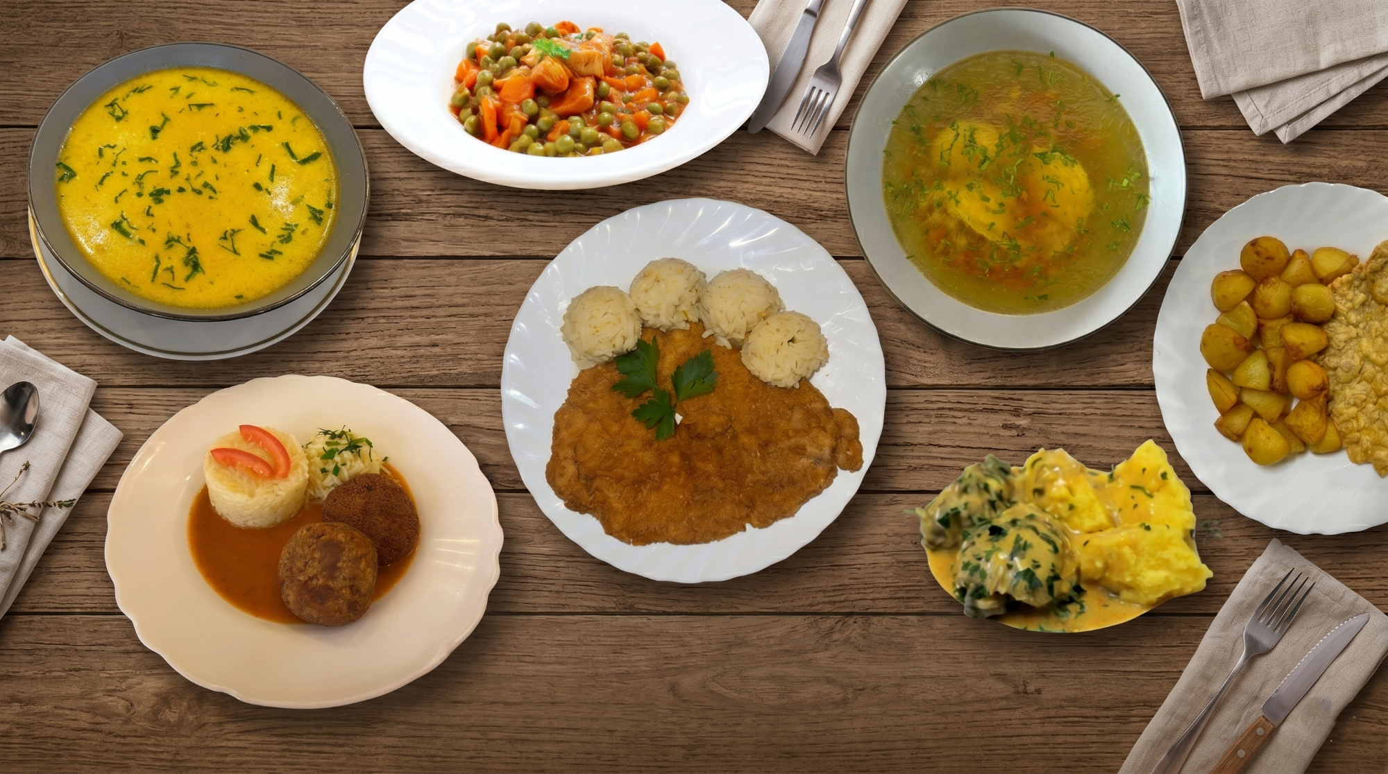 Alege o ciorbă și un fel principal. Pâinea și salata sunt incluse.