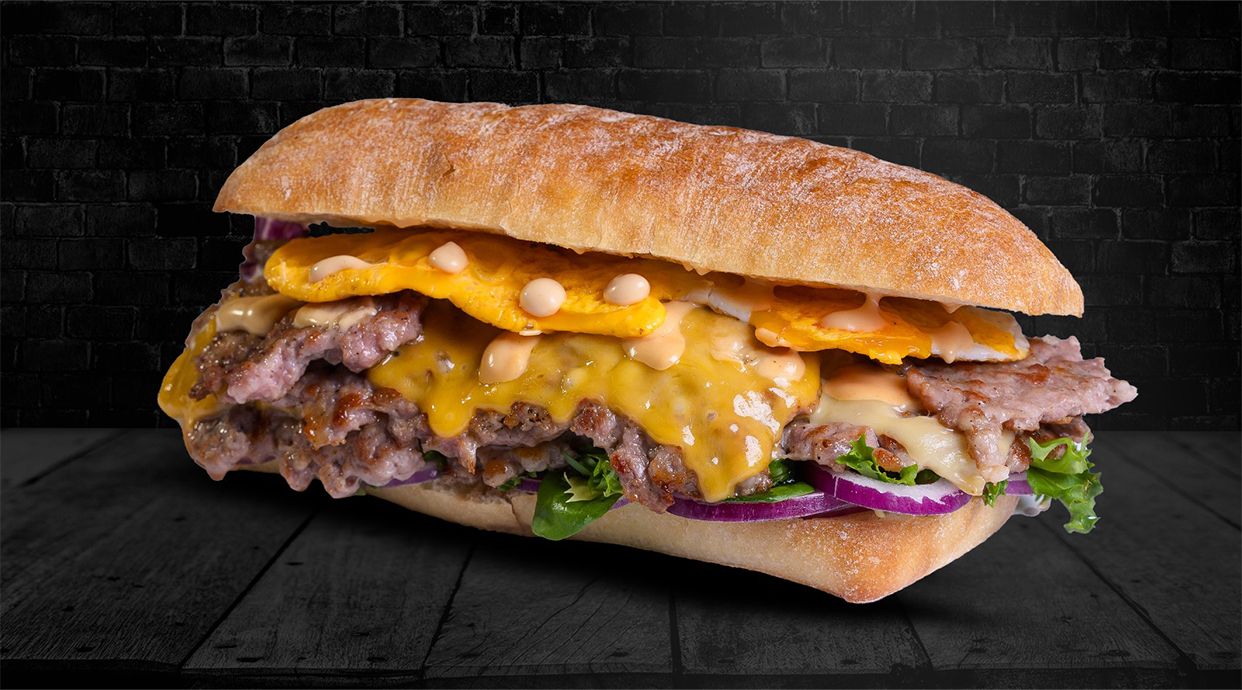 Pâine ciabatta, salsiccia, ou, brânză, ceapă, salată, sos, sos usturoi, cartofi prăjiți - 550g