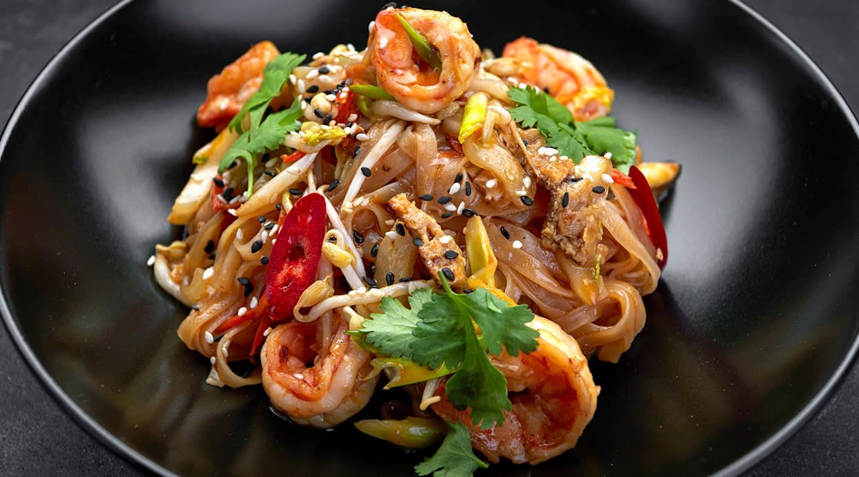 Локшина удон/соба на вибір, креветки, мікс овочів, вершки, соєвий соус, мірін, світ чилі, кунжут, дикий мед, лайм
