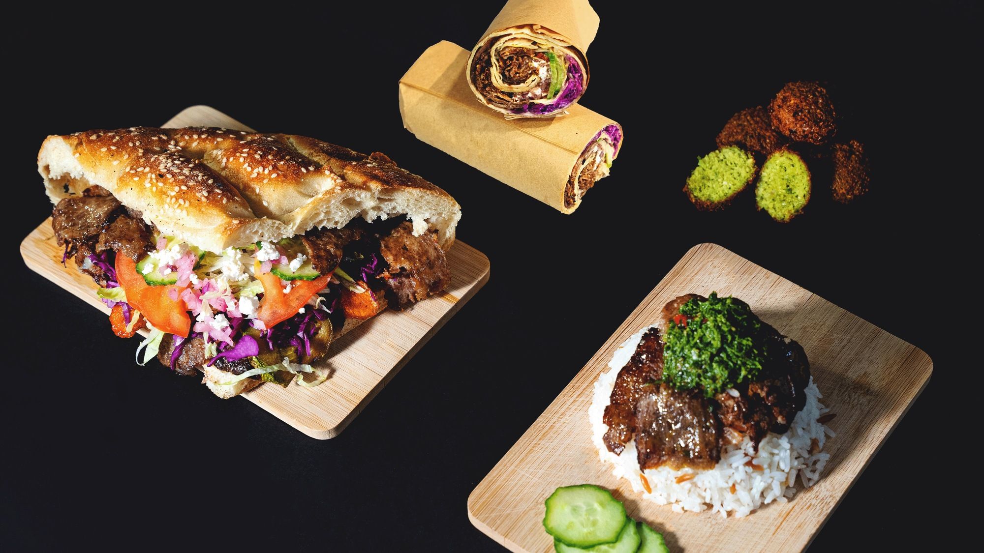 Телешко месо с пържени зеленчуци айсберг, мариновано червено зеле, домат, краставица, маринован лук, млечен сос, сос Dönerstag, краве сирене и топла питка Пиде