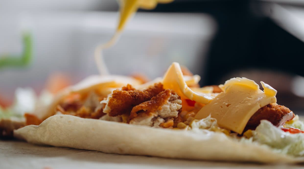 Pan con masa especial enrollada, ternera, pollo, ensalada, salsas y queso