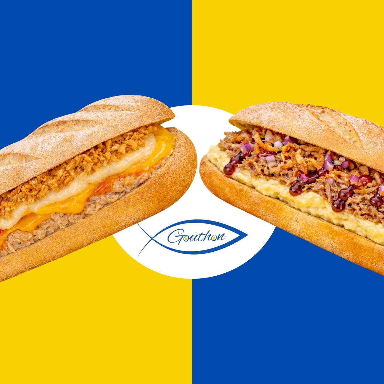 Mini baguette traditionnelle, thon, fromage blanc, fromage rouge, cheddar, oignon crispy