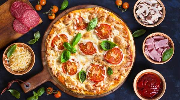 Sauce tomate, olives, mozzarella, poulet charcuterie, fruits de mer, viande hachée