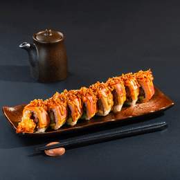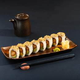 კიბორჩხალის ტემპურა, ავოკადო, სეზამი და საფირმო სოუსი, 8 ნაჭერი. პორციაში შედის სოიოს სოუსი, ჯანჯაფილი და ვასაბი.