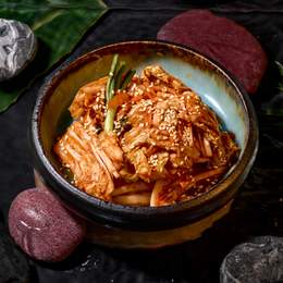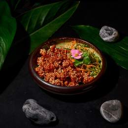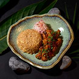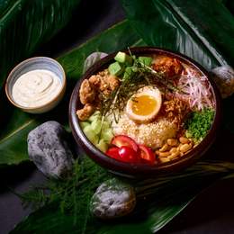 საავტორო პოკე ხრაშუნა ქათმით, კიმ ჩის კომბოსტოსთან და დამარინადებულ კვერცხთან ერთად Signature poke with crispy chicken, kim chi cabbage and marinated egg