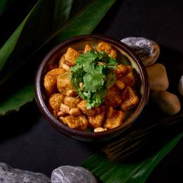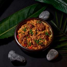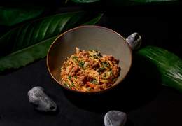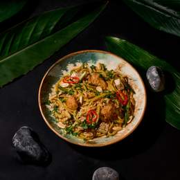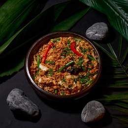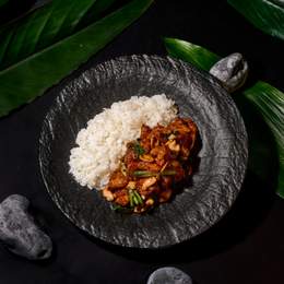 ბრინჯი ქათმით, კუნგ პაოს სოუსით, კვერცხით, ტკბილი წიწაკითა და ქეშიუთი With kung pao sauce, egg, sweet pepper and cashew