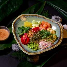 საავტორო პოკე ორაგულით მწიფე მანგოსთან, ედამამესთან და ავოკადოსთან ერთად Signature Salmon Poke with Ripe Mango, Edamame and Avocado