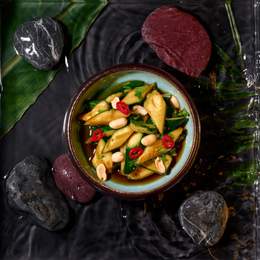 ხრაშუნა ბადრიჯანი ტკბილ-ცხარე სოუსში არაქისთან ერთად Eggplants with a crispy crust, in a sweet-spicy sauce with peanuts
