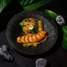 გუაკამოლეს ბალიშზე მოთავსებული ვეფხვისებრი კრევეტები ტომ იამ სოუსში ბოსტნეულის მიქსთან ერთად Tiger prawns in sauce, I ate them on a pillow of guacamole with a mix of vegetables