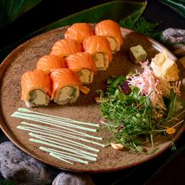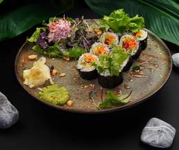 კლასიკური როლი ნორვეგიული ორაგულით, ცინცხალი მწვანილების მიქსითა და საფირმო სოუსით Classic roll with Norwegian salmon, under mix of fresh herbs and signature sauce