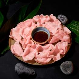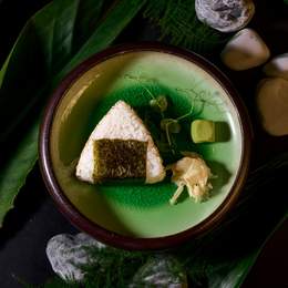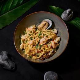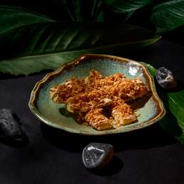 იაპონური ბრინჯის ღვეზელი ვეფხვისებრი კრევეტითა და ტომ იამის სოუსით/Japanese rice cake with tiger shrimp and tom yum sauce