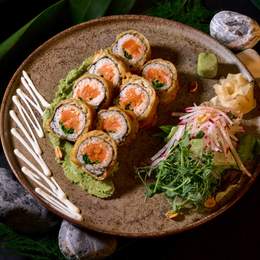 ორაგულის როლი კრევეტითა და კიბორჩხალით კლასიკური გუაკამოლეს ბალიშზე ცინცხალი მწვანილების მიქსითა და საფირმო სოუსით/Salmon roll on a pillow of classic guacamole under mix of fresh herbs and signature sauce