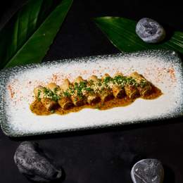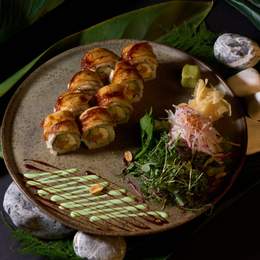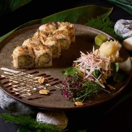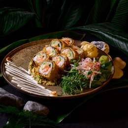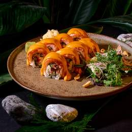 როლი კრემ-ყველით, ხრაშუნა ხახვით, ისპანახითა და ცხარე სოუსით,ცინცხზალი მწვანილის მიქსითა და საფირმო სოუსით Roll with cream cheese, crispy onions, spinach and spicy sauce, under mix of fresh herbs and signature sauce