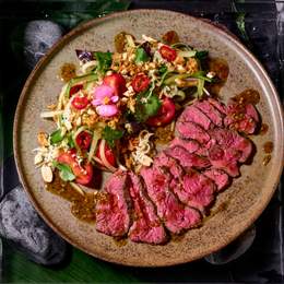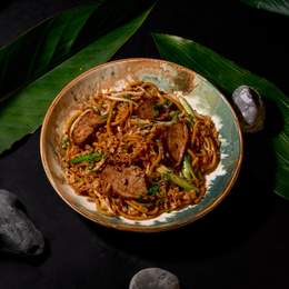 დამარინადებული საქონლის ხორცი ბოსტნეულის მიქსით, ცხარე სოუსითა და ლემონგრასით Marinated beef, mixed vegetables with spicy sauce and lemongrass