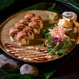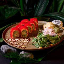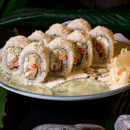 როლი ტუნას ფანტელებით, ტრიუფელის სოუსით, ავოკადოსა და კრემ-ყველის მიქსით, ცინცხალი მწვანილითა და საფირმო სოუსით Roll with tuna flakes, truffle sauce, avocado and cream cheese mix, under mix of fresh herbs and signature sauce