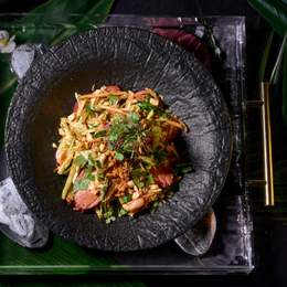 დამარინადებული იხვის მკერდი აისბერგისა და რუკოლას სალათის, ლიჩის, ვაშლისა და ახალი კიტრის ნაზავით Marinated duck breast with a mix of iceberg and arugula salad, lychee, apple and fresh cucumber