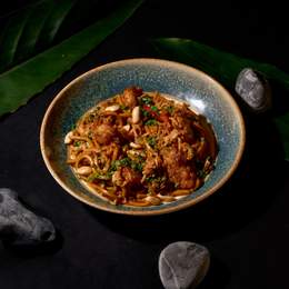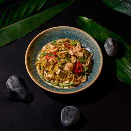უძვლო ქათმის ბარკალი პად ტაი სოუსით, კვერცხის, ტოფუს და ბოსტნეულის ნაზავით Chicken thigh fillet with Thai sauce, egg, tofu and vegetable mix