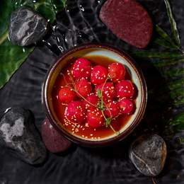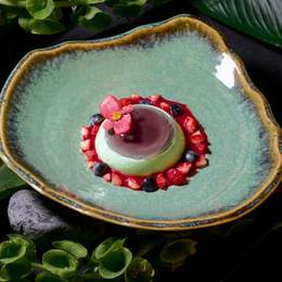 პანაკოტა იის ჟელეთი, კენკრითა და მარწყვისა და ლემონგრასის სოუსით Pnna Cotta with violet jelly, fresh berries and strawberry-lemongrass sauce