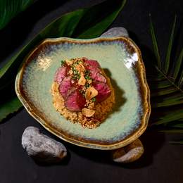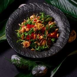 ცხარე რუკოლა ვეფხვისებრი კრევეტით, მწიფე მანგოთი და ტობიკოს ხიზილალით Spicy Arugula with Tiger Prawns, Ripe Mango and Tobiko Caviar