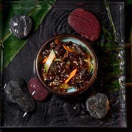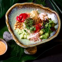 ცხარე პოკე ვეფხვისებრი კრევეტით, ბოლოკით, ავოკადოთი და ტომ იამის სოუსით Spicy poke with tiger shrimp, radish, avocado and tom yum sauce