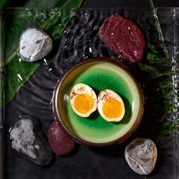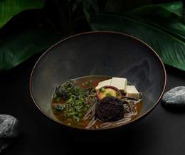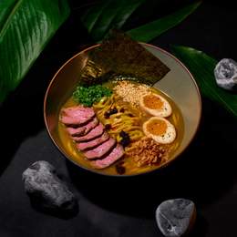 ცხელი, მდიდარი ბულიონი ხელნაკეთი ლაფშათი, დამარინადებული საქონლის ხორცითა და კვერცხით Saturated broth with homemade noodles, marinated beef tenderloin and marinated egg