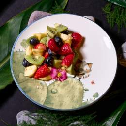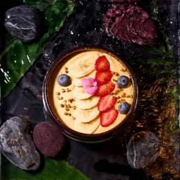 სქელი ტაილანდური მანგოს სმუზი ქოქოსის რძით, კენკრით და წიწიბურას პოპკორნით Thick Thai Mango Smoothie with Coconut Milk, Berries and Buckwheat Popcorn
