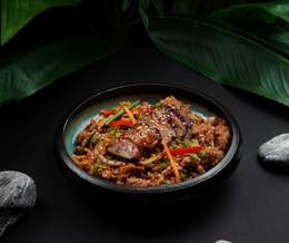 შემწვარი ბრინჯი საქონლის ხორცით წიწაკის სოუსითა და ბოსტნეულის მიქსით With pepper sauce, egg and vegetable mix