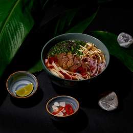 კლასიკური ვიეტნამური წვნიანი საქონლის ხორცითა და ბრინჯის ლაფშათი Classic Vietnamese soup with beef and rice noodles