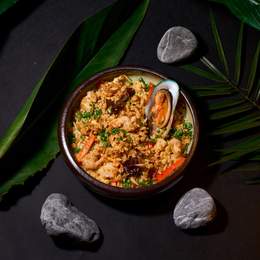 ბრინჯი ზღვის პროდუქტებით ტკბილ-ცხარე სოუსით, კვერცხითა და ბოსტნეულის მიქსი Seafood rice with sweet and spicy sauce, egg and vegetable mix