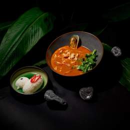 ტაილანდური ცხარე წვნიანი ზღვის პროდუქტებითა და ბრინჯით Spicy Thai soup with seafood and rice