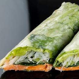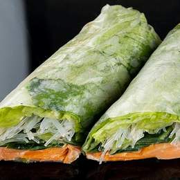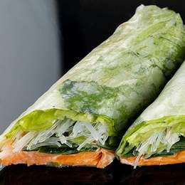 სფრინგ როლი ბრინჯის ფირფიტით,ბრინჯის ნუდელსით, ორაგულით,სპაისით, კიტრით, სტაფილოთი და სალათის ფოთლით. მოყვება სოიოს სოუსი