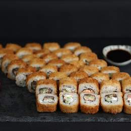 32 ნაჭერი, (1.230კგ) ფილადელფია კრემყველით, New York როლი, საკე ტემპურა, უნაგი მაკი, ჯინჯერი, ვასაბი, სოიოს სოუსი